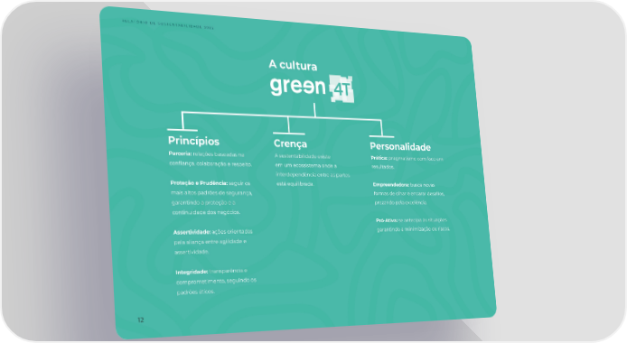 RELATÓRIO DE SUSTENTABILIDADE 2022 A cultura Princípios Crença Personalidade Parceria: relações baseadas na A sustentabilidade existe Prática: pragmatismo com foco em con昀椀ança, colaboração e respeito. em um ecossistema onde a resultados. interdependência entre as partes Proteção e Prudência: seguir os está equilibrada. Empreendedora: busca novas mais altos padrões de segurança, formas de olhar e encarar desa昀椀os, garantindo a proteção e a prezando pela excelência. continuidade dos negócios. Pró-Ativa: se antecipa às situações Assertividade: ações orientadas garantindo a minimização de riscos. pela aliança entre agilidade e assertividade. Integridade: transparência e comprometimento, seguindo os padrões éticos. 12