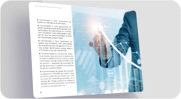 RELATÓRIO DE SUSTENTABILIDADE 2022 3. Centralização e maior governança na gestão de indicadores de processos; 4. Centralização e maior governança na gestão das Requisições de Mudanças, com participação de especialistas em comitês, a 昀椀m de garantir maior efetividade e redu- ção do risco de indisponibilidade durante as manutenções programadas; 5. Centralização e maior governança na gestão dos Incidentes, com participação de especialistas a昀椀m de garantir uma cor- reta análise identi昀椀cando causas raízes e eliminando o risco de recorrências; 6. Implementação de estrutura de Analis- ta de Quality Assurance com o objetivo de realizarem auditorias físicas e de processos nos clientes e coordenações internas, a 昀椀m de garantir a qualidade da prestação de serviço bem como a aderência às práticas de gestão implementadas; 7. Implementação de equipe de especialis- tas disponíveis 24x7x365 que podem atuar de forma presencial ou remota por meio de óculos de realidade aumentada, com o objetivo de mitigar os riscos de indisponi- bilidade operacional durante intervenções corretivas e situações de crise. 82