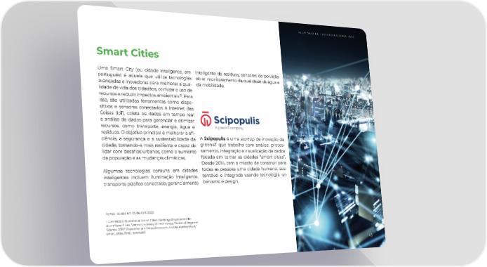 RELATÓRIO DE SUSTENTABILIDADE 2022 Smart Cities Uma Smart City (ou cidade inteligente, em inteligente de resíduos, sensores de poluição português) é aquela que utiliza tecnologias do ar, monitoramento da qualidade da água e avançadas e inovadoras para melhorar a qua- da mobilidade. lidade de vida dos cidadãos, otimizar o uso de [1] recursos e reduzir impactos ambientais . Para isso, são utilizadas ferramentas como dispo- sitivos e sensores conectados à Internet das Coisas (IoT), coleta de dados em tempo real e análise de dados para gerenciar e otimizar recursos, como transporte, energia, água e resíduos. O objetivo principal é melhorar a e昀椀- ciência, a segurança e a sustentabilidade da A Scipopulis é uma startup de inovação da cidade, tornando-a mais resiliente e capaz de green4T que trabalha com análise, proces- lidar com desa昀椀os urbanos, como o aumento samento, integração e visualização de dados da população e as mudanças climáticas. focada em tornar as cidades “smart cities”. Desde 2014, tem a missão de construir para Algumas tecnologias comuns em cidades todas as pessoas uma cidade humana, sus- inteligentes incluem iluminação inteligente, tentável e integrada usando tecnologia, ur- transporte público conectado, gerenciamento banismo e design. Fontes - acesso em 05 de abril, 2023: 1. GIFFINGER, Rudolf et al. Smart Cities: Ranking of European Me- dium-Sized Cities. Vienna University of Technology, Centre of Regional Science, 2007. Disponível em: https://www.smart-cities.eu/download/ smart_cities_昀椀nal_report.pdf 45