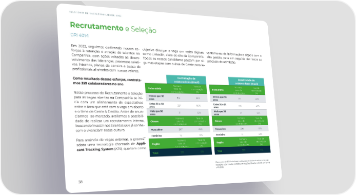 RELATÓRIO DE SUSTENTABILIDADE 2022 Recrutamento e Seleção GRI 401-1 Em 2022, seguimos dedicando nossos es- objetivo divulgar a vaga em redes digitais vantamento de informação e depois com a forços à retenção e atração de talentos na como LinkedIn, além do site da Companhia. alta gestão, para em seguida dar início ao Companhia, com ações voltadas ao desen- Todos os nossos candidatos passam por al- processo de admissão. volvimento das lideranças, processos seleti- gumas etapas com a área de Gente para le- vos internos, planos de carreira e busca de pro昀椀ssionais alinhados com nossos valores. Contratação de Rotatividade de Como resultado desses esforços, contrata- colaboradores (Brasil) colaboradores (Brasil) mos 359 colaboradores no ano. Número Taxa de Número Taxa de Faixa etária total de contratação Faixa etária total de rotatividade Nosso processo de Recrutamento e Seleção contratações (%) contratações (%) para as vagas abertas na Companhia se ini- Menos que 30 104 68% Menos que 30 70 45% anos anos cia com um alinhamento de expectativas Entre 30 e 50 Entre 30 e 50 entre a área que está com a vaga em aberto anos 224 50% anos 186 42% e o time de Gente & Gestão. Antes de anun- Mais que 50 31 32% Mais que 50 31 32% ciarmos ao mercado, avaliamos a possibili- anos anos dade de realizar um recrutamento interno, Número Taxa de Número Taxa de Gênero total de contratação Gênero total de rotatividade buscando investir nos talentos que já conhe- contratações (%) contratações (%) cem e vivenciam nossa cultura. Masculino 287 48% Masculino 236 40% Para anúncio de vagas externas, a green4T Feminino 72 71% Feminino 51 50% adota uma tecnologia chamada de Appli- Número Taxa de Número Taxa de Região total de contratação Região total de rotatividade cant Tracking System (ATS), que tem como contratações (%) contratações (%) Total 359 51% Total 287 41% Para o ano de 2022 não foram coletados os dados de número de con- tratações e demissões divididos em regiões (Brasil e LATAM) conforme o RS 2021. 58
