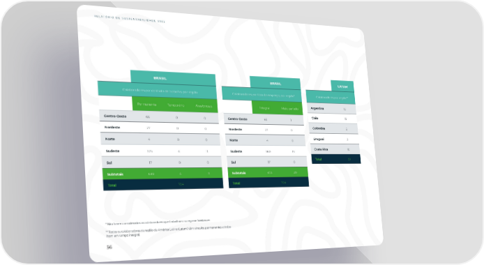 RELATÓRIO DE SUSTENTABILIDADE 2022 BRASIL BRASIL LATAM Colaboradores por contrato de trabalho, por região Colaboradores por tipo de emprego, por região* Colaboradores por região** Faixa etária Permanente Temporário Freelancers Faixa etária Integral Meio período Argentina 19 Centro-Oeste 66 0 0 Centro-Oeste 65 1 Chile 19 Nordeste 27 0 0 Nordeste 27 0 Colômbia 2 Norte 4 0 0 Norte 4 0 Uruguai 3 Sudeste 575 4 11 Sudeste 560 19 Costa Rica 16 Sul 17 0 0 Sul 17 0 Total 59 Subtotais 689 4 11 Subtotais 673 20 Total 704 Total 704 * Não foram considerados os colaboradores que trabalham no regime freelancer. ** Todos os colaboradores da região da América Latina (Latam) têm vínculos permanentes e traba- lham em tempo integral. 56