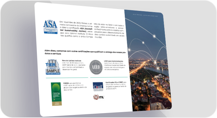 RELATÓRIO DE SUSTENTABILIDADE 2022 Em novembro de 2022, fomos a pri- nhia do setor no Brasil e em toda a meira Companhia da América Latina região latino-americana a possuir a obter a certi昀椀cação ASA (Accredi- conhecimento prático e teórico com- ted Sustainability Advisor), entre- provados para o desenvolvimento de gue pelo Uptime Institute. O título data centers sustentáveis em escala nos quali昀椀ca como a única Compa- mundial. Além disso, contamos com outras certi昀椀cações que quali昀椀cam a entrega dos nossos pro- dutos e serviços: Tiers do Uptime Institute LEED para implementações com mais de 50 data centers sustentáveis de data centers – certi昀椀cados de I a IV – avaliados medida por sustentabilidade do pelo nível de con昀椀abilidade e espaço, uso racional de água e desempenho geral. e昀椀ciência energética. CEEDA para auditoria e Certi昀椀cados ITIL e COBIT para certi昀椀cação de práticas em adoção das melhores práticas e昀椀ciência energética dentro do de gestão e gerenciamento do data center. ambiente de TI. 41
