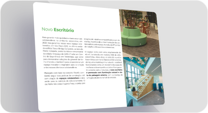 RELATÓRIO DE SUSTENTABILIDADE 2022 Novo Escritório Para garantir mais qualidade e bem-estar aos estações de trabalhos compartilhadas e sem di- colaboradores no ambiente corporativo, em visórias, incentivando a movimentação dos co- 2022 inauguramos nosso novo espaço cola- laboradores pelo espaço. Ao todo, são 97 pontos borativo, em São Paulo (SP), no último andar de trabalho e 80 assentos colaborativos. do edifício Tower Bridge Corporate, ao lado da Ponte Estaiada, ponto turístico e empresarial O espaço conta com uma arquibancada de 2 da cidade. O espaço de 1.419 m inclui um Cen- 43 m², construída em madeira OSB de re昀氀o- tro de Experiência em Tecnologia, que serve restamento. Além disso, as salas de reuniões para demonstrar soluções da green4T de for- foram feitas com forro 昀椀berwood (昀椀bra de ma- ma imersiva, e também para proporcionar um deira), uma matéria-prima natural e reciclável espaço inovador e inspirador para co-criação funcionando como um revestimento capaz de entre nossos clientes e colaboradores. melhorar o desempenho acústico. Para garan- tir conexão com a natureza, o novo escritório Planejado com base no conceito 昀椀twell, o am- é permeado com iluminação natural e vis- biente segue boas práticas de construção civil ta da paisagem externa, com a presença de com criação de espaços colaborativos e área uma jabuticabeira no hall de entrada. verde para os públicos de relacionamento. O escritório não possui lugares 昀椀xos, e conta com 57
