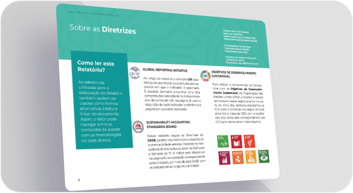 RELATÓRIO DE SUSTENTABILIDADE 2022 Acesse mais informações sobre as diretrizes: Global Reporting Initiative (GRI): Sobre as Diretrizes https://www.globalreporting.org/ Sustainability Accounting Standards Board (SASB): https://www.sasb.org/ Objetivos do Desenvolvimento Sustentável (ODS): http://www.agenda2030.com.br/ Como ler este Relatório? GLOBAL REPORTING INITIATIVE OBJETIVOS DE DESENVOLVIMENTO SUSTENTÁVEL Ao longo do relatório, o símbolo GRI apa- As referências rece junto aos títulos ou subtítulos dos ca- Para reforçar o compromisso da Compa- utilizadas para a pítulos em que o indicador é reportado. nhia com os Objetivos de Desenvolvi- elaboração do Relatório É possível, também, encontrar uma lista mento Sustentável, da Organização das também podem ser completa dos indicadores no índice remis- Nações Unidas (ONU), e explicar a relação usadas como formas sivo de conteúdo GRI, na página 81, com a entre eles e nossos negócios de forma cla- descrição de cada indicador e referência à ra, no início dos capítulos sinalizamos os alternativas à leitura página em que está reportado. ODS com o conteúdo. Na página 88 você linear do documento. encontra o mapa de ODS, com a localiza- Assim, o leitor pode ção dos conteúdos correspondentes aos navegar entre os SUSTAINABILITY ACCOUNTING ODS prioritários para o nosso negócio. conteúdos de acordo STANDARDS BOARD com as metodologias Nosso relatório segue as diretrizes do de cada diretriz. SASB, padrão voluntário para o reporte de sustentabilidade setorial, trazendo os indi- cadores direcionados ao setor de Software e Serviços de TI. O índice está disponível na página 81, e o conteúdo correspondente está sinalizado, por meio da sigla SASB, com os indicadores ao longo da publicação. 8