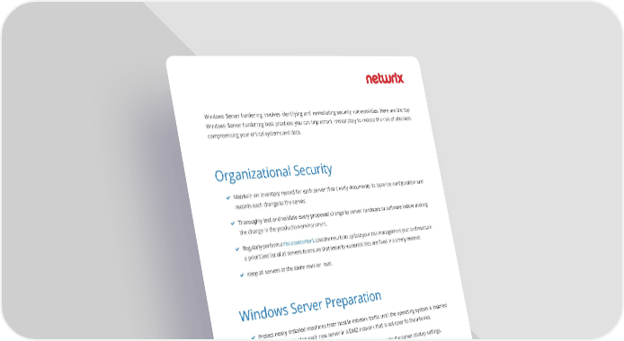 Windows Server hardening involves identifying and remediating security vulnerabilities. Here are the top Windows Server hardening best practices you can implement immediately to reduce the risk of attackers compromising your critical systems and data. Organizational Security Maintain an inventory record for each server that clearly documents its baseline configuration and records each change to the server. Thoroughly test and validate every proposed change to server hardware or software before making the change in the production environment. Regularly perform a risk assessment. Use the results to update your risk management plan and maintain a prioritized list of all servers to ensure that security vulnerabilities are fixed in a timely manner. Keep all servers at the same revision level. Windows Server Preparation Protect newly installed machines from hostile network traffic until the operating system is installed and hardened. Harden each new server in a DMZ network that is not open to the internet. Set a BIOS/firmware password to prevent unauthorized changes to the server startup settings. Disable automatic administrative logon to the recovery console. Configure the device boot order to prevent unauthorized booting from alternate media. 3