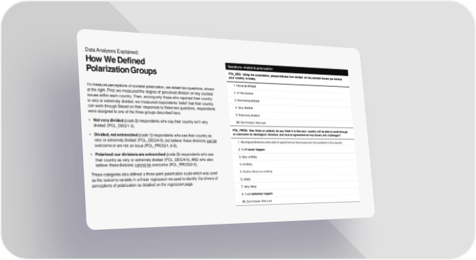 Data Analyses Explained: How We Defined Questions related to polarization Polarization Groups POL_DEG: Using the scale below, please indicate how divided on key societal issues you believe your country is today. 1. Not at all divided To measure perceptions of societal polarization, we asked two questions, shown 2. A little divided at the right. First, we measured the degree of perceived division on key societal issues within each country. Then, among only those who reported their country 3. Somewhat divided is very or extremely divided, we measured respondents’ belief that their country 4. Very divided can work through Based on their responses to these two questions, respondents were assigned to one of the three groups described here: 5. Extremely divided • Not very divided (code 0): respondents who say their country isn’t very 99.Don’t know / Not sure divided (POL_DEG/1-3). POL_PROG: How likely or unlikely do you think it is that your country will be able to work through • Divided, not entrenched (code 1): respondents who see their country as or overcome its ideological divisions and lack of agreement on key issues and challenges? very or extremely divided (POL_DEG/4-5), but believe these divisions can be 1. Ideological divisions and a lack of agreement on key issues are not a problem in this country overcome or are not an issue (POL_PROG/1, 6-8). 2. It will never happen • Polarized: our divisions are entrenched (code 2):respondents who see 3. Very unlikely their country as very or extremely divided (POL_DEG/4-5), AND who also believe these divisions cannot be overcome (POL_PROG/2-5). 4. Unlikely These categories also defined a three-point polarization scale which was used 5. Neither likely nor unlikely as the outcome variable in a linear regression we used to identify the drivers of 6. Likely perceptions of polarization as detailed on the regressionpage. 7. Very likely 8. It will definitely happen 99.Don’t know / Not sure