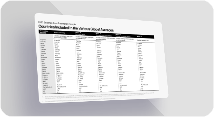 2023 Edelman Trust Barometer: Sample Countries Included in the Various Global Averages 28 countries Global 27 average Global 26 Global 25 Global 24 Global 24 surveyed Excludes France Excludes China and Thailand Excludes China and Thailand Used for current year averages Used for current year averages; Used for tracking to 2022; excludes Used for tracking to 2020; excludes Used for tracking to 2019 and tracking to 2022 excludes France2 sensitive markets1 sensitive markets1 Argentina Argentina Argentina Argentina Argentina Argentina Australia Australia Australia Australia Australia Australia Brazil Brazil Brazil Brazil Brazil Brazil Canada Canada Canada Canada Canada Canada China China China ----- ----- China Colombia Colombia Colombia Colombia Colombia Colombia France France ----- France France France Germany Germany Germany Germany Germany Germany India India India India India India Indonesia Indonesia Indonesia Indonesia Indonesia Indonesia Ireland Ireland Ireland Ireland Ireland Ireland Italy Italy Italy Italy Italy Italy Japan Japan Japan Japan Japan Japan Kenya Kenya Kenya Kenya Kenya ----- Malaysia Malaysia Malaysia Malaysia Malaysia Malaysia Mexico Mexico Mexico Mexico Mexico Mexico Nigeria Nigeria Nigeria Nigeria ----- ----- Saudi Arabia Saudi Arabia Saudi Arabia Saudi Arabia Saudi Arabia Saudi Arabia Singapore Singapore Singapore Singapore Singapore Singapore S. Africa S. Africa S. Africa S. Africa S. Africa S. Africa S. Korea S. Korea S. Korea S. Korea S. Korea S. Korea Spain Spain Spain Spain Spain Spain Sweden ----- ----- ----- ----- ----- Thailand Thailand Thailand ----- ----- ----- The Netherlands The Netherlands The Netherlands The Netherlands The Netherlands The Netherlands UAE UAE UAE UAE UAE UAE UK UK UK UK UK UK U.S. U.S. U.S. U.S. U.S. U.S. 1. Because some of the content we ask is deemed politically sensitive there are several countries where we take special precautionsin order to avoid putting our respondents, or ourselves, in a position to break any local laws. We work closely with our sample partner and its legal team to identify which questions, and in what countries, we should refrain from asking. The twocountries where we removed questions and/or answer options were China and Thailand. 2. Due to a translation inconsistency, the France data was removed from the global data. For more details contact the Trust Barometer research team.