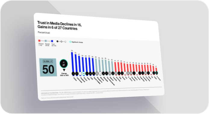 Trust in Media Declines in 16, Gains in 6 of 27 Countries Percent trust - 0 + Significant change Distrust Neutral Trust (1-49) (50-59) (60-100) 79 72 67 63 62 62 60 59 56 55 55 51 50 47 47 46 GLOBAL 27 -1 43 41 41 40 39 38 38 38 38 pt 37 34 50 27 Change, -1 -1 +1 +6 -4 -2 -4 0 +2 -5 -3 0 -2 0 -3 -1 +4 0 n/a -5 +1 -5 -5 0 -2 +2 -1 -6 2022 to 2023 2023 Edelman Trust Barometer. TRU_INS. [MEDIA] Below is a list of institutions. For each one, please indicate how much you trust that institution to do what is right. 9-point scale; top 4 box, trust. General population, 27-mkt avg. *Sweden is not included in the global average. Year-over-year changes were tested for significance using a t-test set at the 99%+ confidence level. Note: in S. Korea, the term used for Media means “News media”.