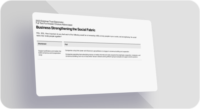 2023 Edelman Trust Barometer: Full Text For Answer Choices Abbreviated Business Strengthening the Social Fabric POL_SOL. How important do you feel each of the following would be to increasing civility among people in your country and strengthening the social fabric that binds people together? Shortened Full Support politicians and media that Companies using their power and influence to get politicians to engage in consensus building and cooperation build consensus and cooperation Companies spending their advertising money on media channels and news programs that emphasize cooperation, moderation, and (avg) consensus building, and not on those which worsen divisions among different groups of people and support extreme positions