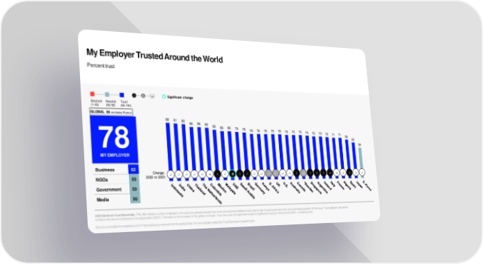 My Employer Trusted Around the World Percent trust - 0 + Significant change Distrust Neutral Trust (1-49) (50-59) (60-100) GLOBAL 26 excludes France 92 91 90 86 86 85 82 80 80 79 78 76 76 76 76 76 75 75 75 74 73 73 72 71 71 68 63 78 54 MY EMPLOYER Business 62 Change, 2022 to 2023 +1 +1 +1 +1 +3 +4 -3 +1 -5 -3 -1 +5 +3 0 0 +2 +1 -1 n/a -1 -2 -1 -4 +4 +2 -4 +3 +1 NGOs 59 Government 50 Media 50 2023 Edelman Trust Barometer.TRU_INS. Below is a list of institutions. For each one, please indicate how much you trust that institution to do what is right.9-point scale; top 4 box, trust. General population, 26-mkt avg.“Your employer” only shown to those who are an employee of an organization (Q43/1). *Sweden is not included in the global average. Year-over-year changes were tested for significance using a t-test set at the 99%+ confidence level. Due to a translation inconsistency, the France data was removed from the global data. For more details contact the Trust Barometer research team.