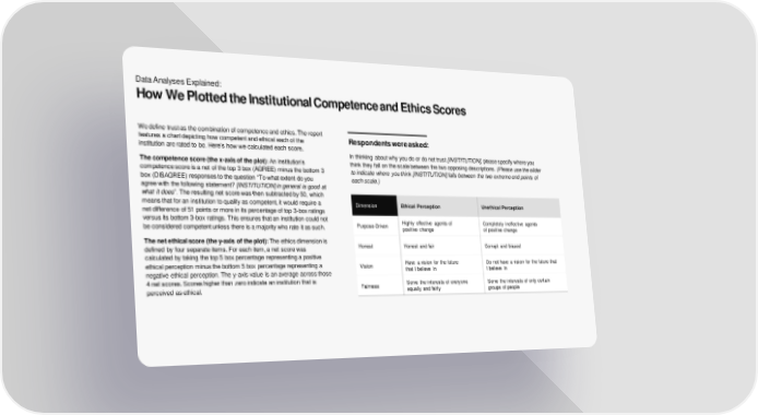 Data Analyses Explained: How We Plotted the Institutional Competence and Ethics Scores We define trust as the combination of competence and ethics. The report features a chart depicting how competent and ethical each of the Respondents were asked: institution are rated to be. Here’s how we calculated each score. In thinking about why you do or do not trust [INSTITUTION], please specify where you The competence score (the x-axis of the plot): An institution’s think they fall on the scale between the two opposing descriptions. (Please use the slider competence score is a net of the top 3 box (AGREE) minus the bottom 3 to indicate where you think [INSTITUTION] falls between the two extreme end points of box (DISAGREE) responses to the question “To what extent do you each scale.) agree with the following statement? [INSTITUTION] in general is good at what it does”. The resulting net score was then subtracted by 50, which means that for an institution to qualify as competent, it would require a Dimension Ethical Perception Unethical Perception net difference of 51 points or more in its percentage of top 3-box ratings versus its bottom 3-box ratings. This ensures that an institution could not Highly effective agents of Completely ineffective agents be considered competent unless there is a majority who rate it as such. Purpose-Driven positive change of positive change The net ethical score (the y-axis of the plot):The ethics dimension is Honest Honest and fair Corrupt and biased defined by four separate items. For each item, a net score was calculated by taking the top 5 box percentage representing a positive ethical perception minus the bottom 5 box percentage representing a Vision Have a vision for the future Do not have a vision for the future that negative ethical perception. The y-axis value is an average across those that I believe in I believe in 4 net scores. Scores higher than zero indicate an institution that is Fairness Serve the interests of everyone Serve the interests of only certain perceived as ethical. equally and fairly groups of people