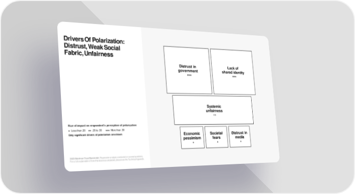 Drivers Of Polarization: Distrust, Weak Social Fabric, Unfairness Distrust in Lack of government shared identity +++ +++ Systemic unfairness ++ Size of impact on respondent’s perception of polarization + Less than .20 ++ .20 to .30 +++ More than .30 Only significant drivers of polarization are shown Economic Societal Distrust in pessimism fears media + + + 2023 Edelman Trust Barometer. Regression analysis conducted on several questions. For a full explanation of how this data was calculated, please see the Technical Appendix.