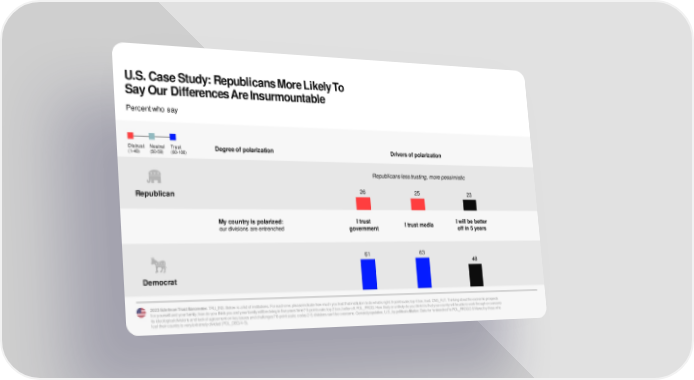 U.S. Case Study: Republicans More Likely To Say Our Differences Are Insurmountable Percent who say Distrust Neutral Trust Degree of polarization Drivers of polarization (1-49) (50-59) (60-100) Republicans less trusting, more pessimistic 26 25 23 Republicans more Republican polarized, less trusting, more pessimistic My country is polarized: I trust I trust media I will be better our divisions are entrenched government off in 5 years 61 63 48 Democrats more Democrat likely to have many societal concerns 2023 Edelman Trust Barometer. TRU_INS. Below is a list of institutions. For each one, please indicate how much you trust that institution to do what is right.9-point scale; top 4 box, trust. CNG_FUT. Thinking about the economic prospects for yourself and your family, how do you think you and your family will be doing in five years’ time? 5-point scale; top 2 box, better off. POL_PROG. How likely or unlikely do you think it is that your country will be able to work through or overcome its ideological divisions and lack of agreement on key issues and challenges? 8-point scale; codes 2-5, divisions can’t be overcome. General population, U.S., by political affiliation. Data for “entrenched” is POL_PROG/2-5 filtered by those who feel their country is very/extremely divided (POL_DEG/4-5).