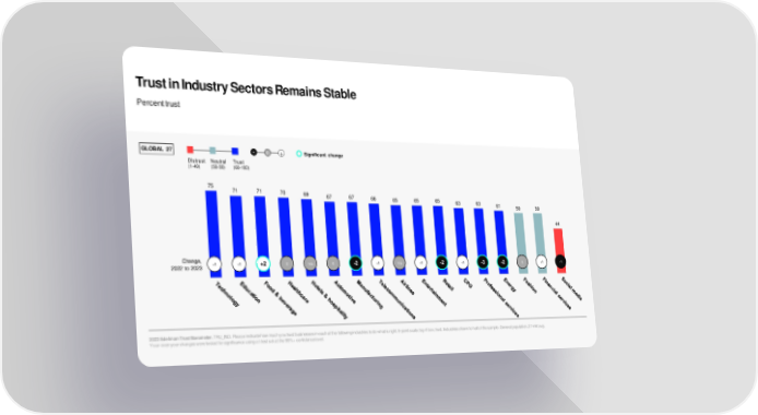 Trust in Industry Sectors Remains Stable Percent trust GLOBAL 27 - 0 + Significant change Distrust Neutral Trust (1-49) (50-59) (60-100) 75 71 71 70 69 67 67 66 65 65 65 63 63 61 59 59 44 Change, +1 +1 +2 0 n/a 0 -2 +1 n/a +1 -2 +1 -3 -2 0 +1 -1 2022 to 2023 2023 Edelman Trust Barometer. TRU_IND. Please indicate how much you trust businesses in each of the following industries to do what is right. 9-point scale; top 4 box, trust. Industries shown to half of the sample. General population, 27-mkt avg. Year-over-year changes were tested for significance using a t-test set at the 99%+ confidence level.