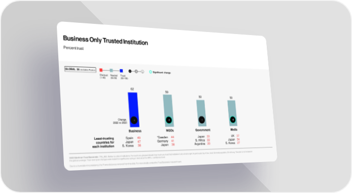 Business Only Trusted Institution Percent trust GLOBAL 26 excludes France - 0 + Significant change Distrust Neutral Trust (1-49) (50-59) (60-100) 62 59 50 50 Change, -1 -1 -1 -2 2022 to 2023 Business NGOs Government Media Least-trusting Spain 49 *Sweden 44 Japan 33 UK 37 countries for Japan 47 Germany 41 S.Africa 22 Japan 34 each institution S. Korea 38 Japan 38 Argentina 20 S. Korea 27 2023 Edelman Trust Barometer. TRU_INS. Below is a list of institutions. For each one, please indicate how much you trust that institution to do what is right.9-point scale; top 4 box, trust. General population, 26-mkt avg. *Sweden is not included in the global average. Year-over-year changes were tested for significance using a t-test set at the 99%+ confidence level. Due to a translation inconsistency, the France data was removed from this slide. For more details contact the Trust Barometerresearch team.