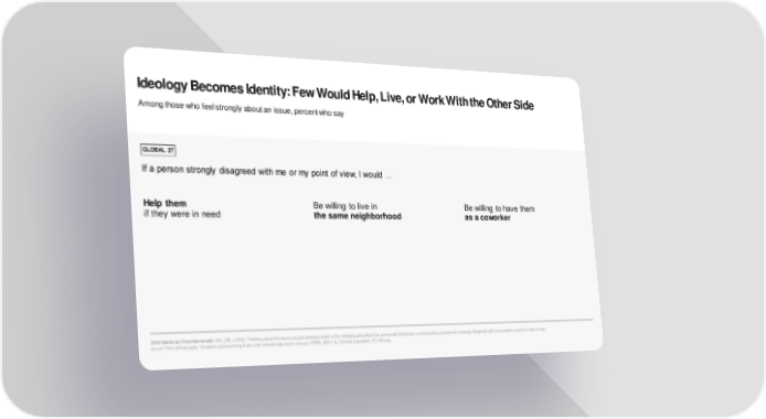 Ideology Becomes Identity: Few Would Help, Live, or Work With the Other Side Among those who feel strongly about an issue, percent who say GLOBAL 27 If a person strongly disagreed with me or my point of view, I would … Help them Be willing to live in Be willing to have them if they were in need the same neighborhood as a coworker 2023 Edelman Trust Barometer. ISS_DIF_CONS. Thinking about the issue you just selected, which of the following describes how you would feel about, or act towards, a person who strongly disagreed with your position or point of view on that issue? Pick all that apply. Question asked among those who feel strongly about an issue (PERS_ISS/1-5). General population, 27-mkt avg.