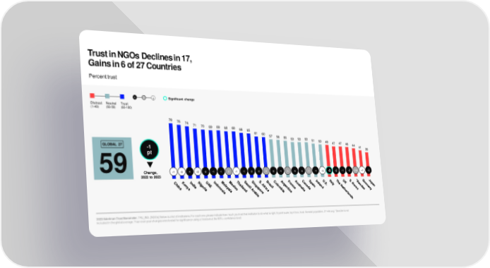 Trust in NGOs Declines in 17, Gains in 6 of 27 Countries Percent trust - 0 + Significant change Distrust Neutral Trust (1-49) (50-59) (60-100) 78 76 74 71 70 69 69 68 68 66 65 61 60 57 56 55 53 53 53 51 50 49 47 47 46 GLOBAL 27 -1 44 41 59 pt 38 Change, +1 +3 -4 +2 -3 -1 -1 0 +1 -1 -3 -2 0 -2 -4 0 -5 -2 0 -4 +5 -5 -2 -1 -2 n/a +1 -3 2022 to 2023 2023 Edelman Trust Barometer. TRU_INS. [NGOs] Below is a list of institutions. For each one, please indicate how much you trust that institution to do what is right. 9-point scale; top 4 box, trust. General population, 27-mkt avg. *Sweden is not included in the global average. Year-over-year changes were tested for significance using a t-test set at the 99%+ confidence level.