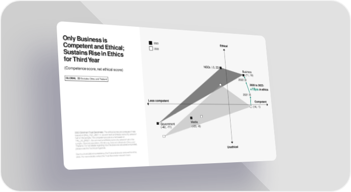 Only Business is 2023 Ethical Competent and Ethical; 2020 Sustains Rise in Ethics for Third Year NGOs (-3, 22) (Competence score, net ethical score) Business (11, 18) 2022 GLOBAL 23 Excludes China and Thailand 2020 to 2023: +19pts in ethics 2021 Less competent Competent (14, -1) Government Media (-42, -11) (-23, -8) 2023 Edelman Trust Barometer. The ethical scores are averages of nets based on [INS]_PER_DIM/1-4. Government and Media were only asked of half of the sample. The competence score is a net based on TRU_3D_[INS]/1. Government and Media were only asked of half of the sample. General population, 23-mkt avg. Data not collected in China and Thailand. For full details regarding how this data was calculated and plotted, please see the Technical Appendix. Due to a translation inconsistency, the France data was removed from this Unethical slide. For more details contact the Trust Barometer research team.