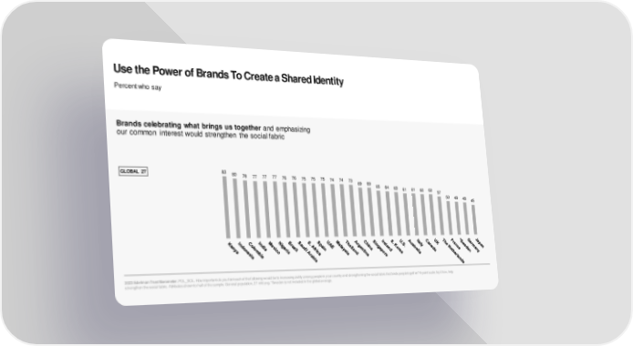 Use the Power of Brands To Create a Shared Identity Percent who say Brands celebrating what brings us together and emphasizing our common interest would strengthen the social fabric GLOBAL 27 83 80 78 77 77 77 76 76 75 75 75 74 74 73 69 69 65 64 63 61 61 60 60 57 50 49 48 45 2023 Edelman Trust Barometer. POL_SOL. How important do you feel each of the following would be to increasing civility among people in your country and strengthening the social fabric that binds people together? 6-point scale; top 3 box, help strengthen the social fabric. Attributes shown to half of the sample. General population, 27-mkt avg. *Sweden is not included inthe global average.