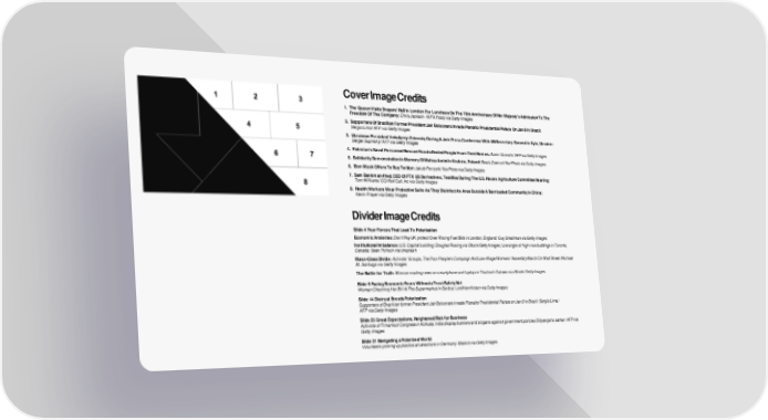 Cover Image Credits 1. The Queen Visits Drapers' Hall in London For Luncheon On The 70th Anniversary Of Her Majesty's Admission To The Freedom Of The Company: ChrisJackson -WPA Poolpvia Getty Images 2. Supporters Of Brazilian Former President Jair Bolsonaro Invade PlanaltoPresidential Palace On Jan 8 In Brazil: Sergio Lima/ AFP via Getty Images 3. Ukrainian President Volodymyr Zelensky During A Join Press Conference With UN Secretary-General in Kyiv, Ukraine: Sergei Supinsky/ AFP via Getty Images 4. Pakistan’s Naval Personnel Rescue Flood-affected People From Their Homes: Aamir Qureshi/ AFP via Getty Images 5. Solidarity Demonstration In Memory Of MahsaAminiIn Krakow, Poland: Beata Zawrzel/ NurPhotovia Getty Images 6. Elon Musk Offers To Buy Twitter: Jakub Porzycki/ NurPhotovia Getty Images 7. Sam Bankman-fried, CEO Of FTX US Derivatives, Testifies During The U.S. House Agriculture Committee Hearing: Tom Williams/ CQ-Roll Call, Inc via Getty Images 8. Health Workers Wear Protective Suits As They Disinfect An Area Outside A Barricaded Community in China: Kevin Frayer via Getty Images Divider Image Credits Slide 4 Four Forces That Lead To Polarization Economic Anxieties: Don’t Pay UK protest Over Rising Fuel Bills in London, England: Guy Smallman via Getty Images Institutional Imbalance: U.S. Capital building: Douglas Rissingvia iStock/Getty Images; Low angle of high-rise buildings in Toronto, Canada: Sean Pollock via Unsplash Mass-Class Divide: Activists' Groups, The Poor People's Campaign And Low-Wage Workers' Assembly March On Wall Street: Michael M.Santiago via Getty Images The Battle for Truth: Womanreading news on smartphone and laptop in Thailand: Oatawa via iStock/ Getty Images Slide 5 Facing Economic Fears Without a Trust Safety Net Woman Checking Her Bill At The Supermarket in Serbia: LordHenriVotonvia Getty Images Slide 14 Distrust Breeds Polarization Supporters of Brazilian former President Jair Bolsonaro invade PlanaltoPresidential Palace on Jan 8 in Brazil: Sergio Lima / AFP via Getty Images Slide 25 Great Expectations, Heightened Risk for Business Activists of Trinamool Congress in Kolkata, India display banners and slogans against government policies Dibyangshusarkar/ AFP via Getty Images Slide 31 Navigating a Polarized World Volunteers picking up plastics at lakeshore in Germany: Maskotvia Getty Images