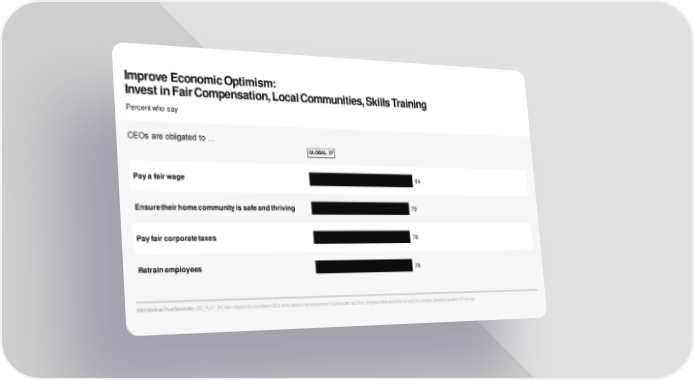 Improve Economic Optimism: Invest in Fair Compensation, Local Communities, Skills Training Percent who say CEOs are obligated to … GLOBAL 27 Pay a fair wage 84 Ensure their home community is safe and thriving 79 Pay fair corporate taxes 78 Retrain employees 78 2023 Edelman Trust Barometer. CEO_PLAY_BK. How obligated do you believe CEOs are to take the following actions? 5-point scale; top 3 box, obligated. Attributes shown to half of the sample. General population, 27-mkt avg.