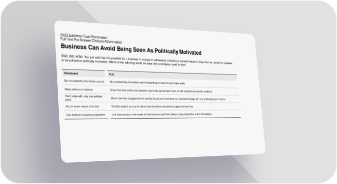 2023 Edelman Trust Barometer: Full Text For Answer Choices Abbreviated Business Can Avoid Being Seen As Politically Motivated ENG_ISS_HOW. You just said that it is possible for a business to engage in addressing contentious societal issues in ways that you would not consider to be political or politically motivated. Which of the following would be ways that a company could do that? Shortened Full Be a trustworthy information source Be a trustworthy information source regarding an issue but don’t take sides Base actions on science Show that their actions are based on generally agreed upon facts or well-established scientific evidence Don’t align with only one political Show how their engagement on societal issues over time does not consistently align with one political party or another party Act on same values over time Tie their actions to a set of values that they have consistently supported over time Link actions to staying competitive Link their actions to the needs of their business and their ability to stay competitive in the marketplace