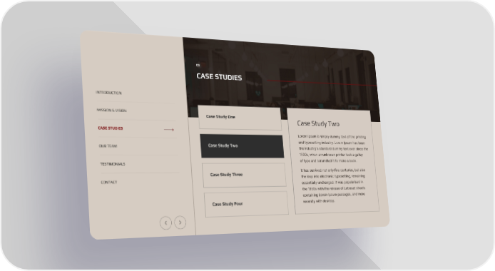 03 CASE STUDIES INTRODUCTION MISSION & VISION Case Study One Case Study Two CASE STUDIES Lorem Ipsum is simply dummy text of the printing and typesetting industry. Lorem Ipsum has been Case Study Two OUR TEAM the industry's standard dummy text ever since the 1500s, when an unknown printer took a galley of type and scrambled it to make a book. TESTIMONIALS It has survived not only five centuries, but also Case Study Three the leap into electronic typesetting, remaining CONTACT essentially unchanged. It was popularised in the 1960s with the release of Letraset sheets containing Lorem Ipsum passages, and more recently with desktop. Case Study Four