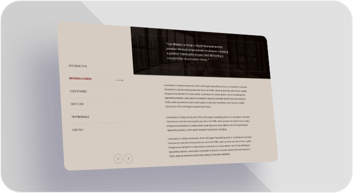 "Our Mission is to be a major financial service provider through empowered employees creating a positive community impact and delivering a completitive shareholder return." INTRODUCTION MISSION & VISION Lorem Ipsum is simply dummy text of the printingand typesetting industry. Lorem Ipsum has been the industry's standard dummy text ever since the 1500s, when an unknown printer took a galley CASE STUDIES of type and scrambled it to make a book. Lorem Ipsum is simply dummy text of the printingand typesetting industry. Lorem Ipsum has beenthe industry's standard dummy text ever since the 1500s, when an unknown printer took a galley of type and scrambled. Lorem Ipsum is simply OUR TEAM dummy text of the printingand typesetting industry. TESTIMONIALS Lorem Ipsum is simply dummy text of the printingand typesetting industry. Lorem Ipsum has been the industry's standard dummy text ever since the 1500s, when an unknown printer took a galley of type and scrambled it to make a book. Lorem Ipsum is simply dummy text of the printingand CONTACT typesetting industry. Lorem Ipsum has been the industry's standard. Lorem Ipsum is simply dummy text of the printingand typesetting industry. Lorem Ipsum has been the industry's standard dummy text ever since the 1500s, when an unknown printer took a galley of type and scrambled it to make a book. Lorem Ipsum is simply dummy text of the printingand typesetting industry. Lorem Ipsum has beenthe industry's standard dummy text ever since the 1500s, when an unknown printer took a galley of type and scrambled.