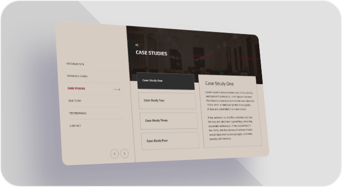 03 CASE STUDIES INTRODUCTION MISSION & VISION Case Study One Case Study One CASE STUDIES Lorem Ipsum is simply dummy text of the printing and typesetting industry. Lorem Ipsum has been the industry's standard dummy text ever since the Case Study Two OUR TEAM 1500s, when an unknown printer took a galley of type and scrambled it to make a book. TESTIMONIALS It has survived not only five centuries, but also Case Study Three the leap into electronic typesetting, remaining CONTACT essentially unchanged. It was popularised in the 1960s with the release of Letraset sheets containing Lorem Ipsum passages, and more recently with desktop. Case Study Four