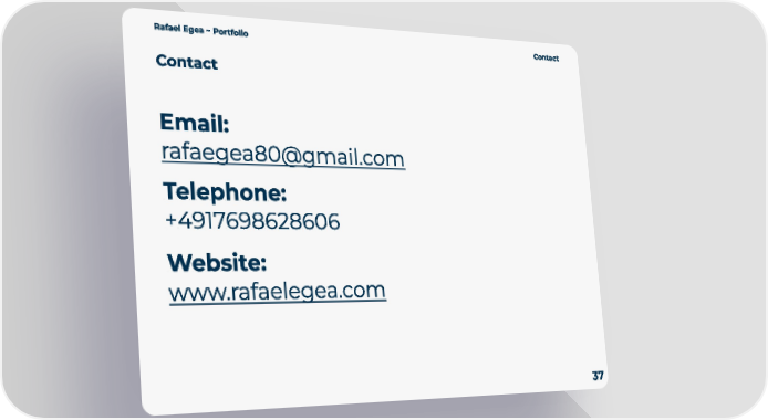 Rafa el Egea ~ Por tfolio Conta c t 37 Conta c t Email: [email protected] Teleph on e: + 4917698628606 Website: www.rafaelegea.com