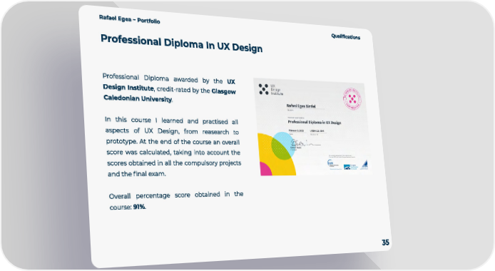Rafa el Egea ~ Por tfolio Qualifications 35 Professional Diploma awarded by th e UX Design Institute, credit-rated by th e Glasgow Caledonian University. In this course I learn ed an d pra c tised all aspec ts of UX Design, f rom reasearch to prototype. At th e en d of th e course an overall score was calculated, takin g into a ccount th e scores obtain ed in all th e compulsor y projec ts an d th e final exam. Overall percenta ge score obtain ed in th e course: 91%. Professional Diploma in UX Design