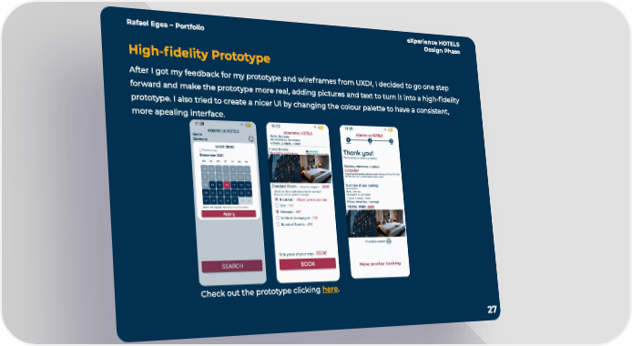 Rafa el Egea ~ Por tfolio eXperien ce HOTELS Design Phase 27 High- fidelity Prototype After I got my feedba ck for my prototype an d wiref ram es f rom UXDI, I decided to go on e step for ward an d make th e prototype m ore real, a ddin g pic tures an d text to turn it into a high- fidelity prototype. I also tried to create a nicer UI by chan gin g th e colour palette to have a consistent , m ore apealin g interfa ce. Check out the prototype clicking . here