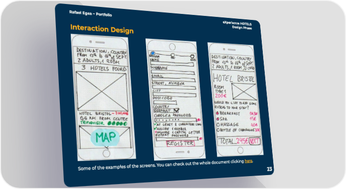 Rafa el Egea ~ Por tfolio eXperien ce HOTELS Design Phase 23 Intera c tion Design Som e of th e examples of th e screens. You can ch eck out th e wh ole docum ent clickin g . h ere