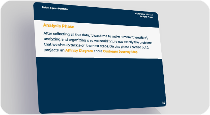 Rafa el Egea ~ Por tfolio eXperien ce HOTELS Analysis Phase 14 Analysis Phase After collec ting all this data, it was time to make it more “digestible”, analyzing and organizing it so we could figure out exac tly the problems that we should tackle on the next steps. On this phase I carried out 2 projec ts: an and a . Affinity Dia gram Custom er Journ ey Map