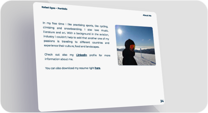 Rafa el Egea ~ Por tfolio About Me 34 In my free time I like prac tising spor ts, like cycling, climbing and snowboarding. I also love music , literature and ar t . With a background in the aviation, industr y I couldn't help to add that another one of my passions is traveling to dif ferent countries and experience their cul ture, food and landscapes. Check out also my Linkedin profile for more information about me. You can also download my resume right h ere.