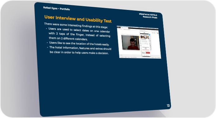 Rafa el Egea ~ Por tfolio eXperien ce HOTELS Research Phase 13 User Inter view an d Usability Test Th ere were som e interestin g fin din gs at this sta ge:H A Users are used to selec t dates on on e calen dar with 2 taps of th e fin ger, instea d of selec tin g th em on 2 different calen dars7 A Users like to see th e location of th e h otels easily7 A Th e h otel information, features an d extras sh ould be clear in order to h elp users make a decision.
