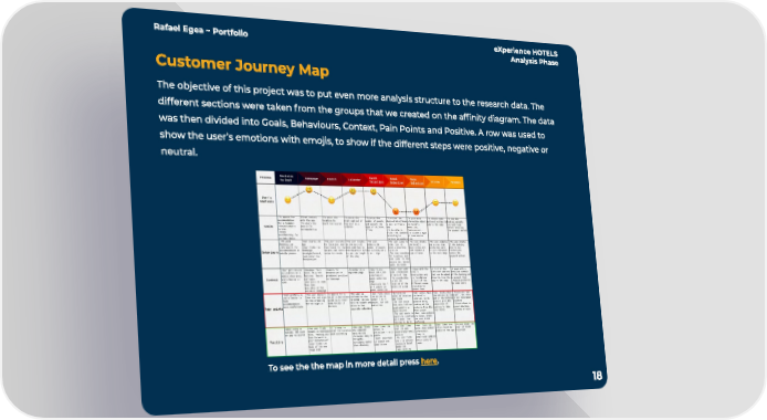 Rafa el Egea ~ Por tfolio eXperien ce HOTELS Analysis Phase 18 Custom er Journ ey Map Th e objec tive of this projec t was to put even m ore analysis struc ture to th e research data. Th e different sec tions were taken f rom th e groups that we created on th e affinity dia gram. Th e data was th en divided into Goals, Behaviours, Context , Pain Points an d Positive. A row was used to sh ow th e user ’s em otions with em ojis, to sh ow if th e different steps were positive, n egative or n eutral. To see th e th e map in m ore detail press . h ere