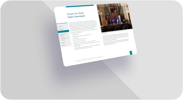 Feature: Our Racial Equity Commitment We believe our business is stronger when our economy is more inclusive, which is why in 2020, JPMorgan Chase announced its $30 billion Racial Equity Commitment to help close the racial wealth gap and advance economic inclusion INTRODUCTION among Black, Hispanic, Latino and underserved customers and communities in the U.S. The commitment includes incre- 11 mental lending and equity investments , as well as philanthropic capital, products and services. While the original com- ENVIRONMENTAL mitment period extends through 2025, we intend to continue working to advance racial equity with the long-term in mind, laying the groundwork, innovating our business practices, and advancing solutions to provide more equitable SOCIAL access to fnancial opportunities for Black, Hispanic, Latino, and underserved customers and communities. 12 As of December 31, 2022, we are reporting nearly $29 billion of progress toward our fve-year Racial Equity Commit- Feature: Our Racial Equity ment, which focuses on the following key areas: Commitment • I Inclusive Growth ncreasing Homeownership Diversity, Equity and Inclusion • Expanding afordable rental housing and support for vital community institutions The Firm is striving to help close the racial wealth gap and advance economic inclusion through fnancial health and wealth creation workshops and community events across the country. Pictured: Atlanta, Georgia Human Capital • Growing small businesses • Spending more with Black, Hispanic and Latino suppliers The Racial Equity Commitment’s 2022 progress was largely driven by incentives for afordable rental housing preservation and GOVERNANCE • Improving fnancial health and access to banking homeownership refnancing—areas where the Firm incentivized the preservation of afordable housing, while rents rose rapidly, and saved customers money on their mortgages, while rates were historically low. With that said, as rates continue to rise, our APPENDICES • Investing in Minority Depository Institutions and Community Development Financial Institutions incremental progress continues to be impacted, most notably in the areas of homeownership and small business. For instance, • Providing Philanthropic Capital to advance an inclusive economic recovery and support Black, Hispanic, Latino and we have lost ground on progress of our refnancing commitment. underserved communities While we are pleased with achieving nearly $29 billion of progress, volatile market conditions, including rising interest rates, • Accelerating investment in employees and building a more diverse and inclusive workforce. Please see the Diver- contributed to slower progress against our commitment and may continue to present challenges. For detailed information on sity Equity & Inclusion section on page 38 for updates on our hiring goals. each commitment’s progress, please see our website. 11 Refects new products or investments since the October 2020 announcement or incremental dollars and/or units (annual results measured as progress against 2019 business results). 12 REC reported progress of $28.9 billion is refected in both dollars and units, as applicable in the Racial Equity Commitment Progress Update on our website. 25