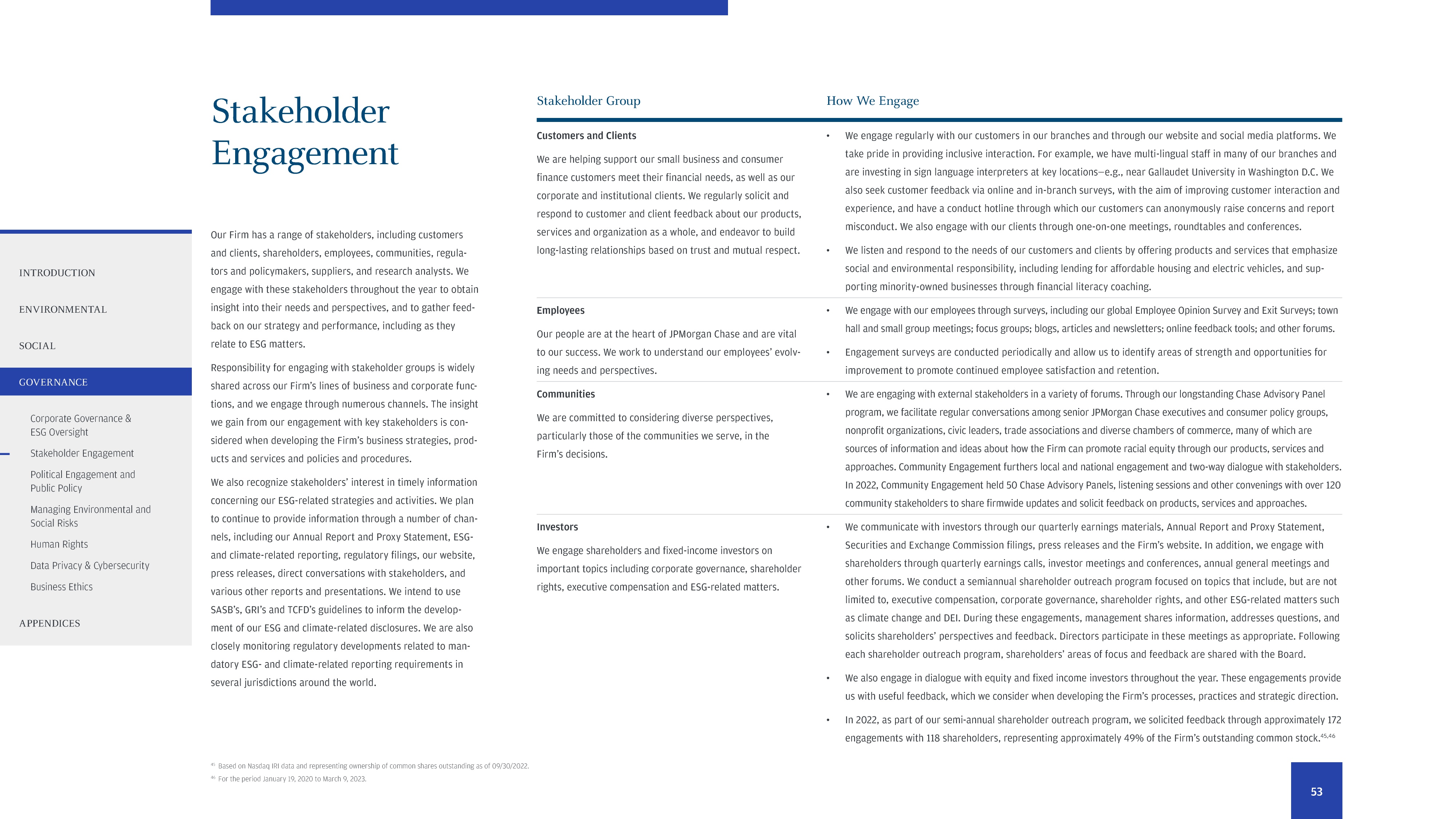 Stakeholder Stakeholder Group How We Engage Customers and Clients • We engage regularly with our customers in our branches and through our website and social media platforms. We Engagement We are helping support our small business and consumer take pride in providing inclusive interaction. For example, we have multi-lingual staf in many of our branches and fnance customers meet their fnancial needs, as well as our are investing in sign language interpreters at key locations—e.g., near Gallaudet University in Washington D.C. We corporate and institutional clients. We regularly solicit and also seek customer feedback via online and in-branch surveys, with the aim of improving customer interaction and respond to customer and client feedback about our products, experience, and have a conduct hotline through which our customers can anonymously raise concerns and report Our Firm has a range of stakeholders, including customers services and organization as a whole, and endeavor to build misconduct. We also engage with our clients through one-on-one meetings, roundtables and conferences. and clients, shareholders, employees, communities, regula- long-lasting relationships based on trust and mutual respect. • We listen and respond to the needs of our customers and clients by ofering products and services that emphasize INTRODUCTION tors and policymakers, suppliers, and research analysts. We social and environmental responsibility, including lending for afordable housing and electric vehicles, and sup- engage with these stakeholders throughout the year to obtain porting minority-owned businesses through fnancial literacy coaching. ENVIRONMENTAL insight into their needs and perspectives, and to gather feed- Employees • We engage with our employees through surveys, including our global Employee Opinion Survey and Exit Surveys; town back on our strategy and performance, including as they Our people are at the heart of JPMorgan Chase and are vital hall and small group meetings; focus groups; blogs, articles and newsletters; online feedback tools; and other forums. SOCIAL relate to ESG matters. t o our success. We work to understand our employees’ evolv- • Engagement surveys are conducted periodically and allow us to identify areas of strength and opportunities for Responsibility for engaging with stakeholder groups is widely ing needs and perspectives. improvement to promote continued employee satisfaction and retention. GOVERNANCE shared across our Firm’s lines of business and corporate func- Communities • We are engaging with external stakeholders in a variety of forums. Through our longstanding Chase Advisory Panel tions, and we engage through numerous channels. The insight program, we facilitate regular conversations among senior JPMorgan Chase executives and consumer policy groups, Corporate Governance & we gain from our engagement with key stakeholders is con- We are committed to considering diverse perspectives, ESG Oversight particularly those of the communities we serve, in the nonproft organizations, civic leaders, trade associations and diverse chambers of commerce, many of which are sidered when developing the Firm’s business strategies, prod- sources of information and ideas about how the Firm can promote racial equity through our products, services and Stakeholder Engagement ucts and services and policies and procedures. Firm’s decisions. Political Engagement and approaches. Community Engagement furthers local and national engagement and two-way dialogue with stakeholders. Public Policy We also recognize stakeholders’ interest in timely information In 2022, Community Engagement held 50 Chase Advisory Panels, listening sessions and other convenings with over 120 Managing Environmental and concerning our ESG-related strategies and activities. We plan community stakeholders to share frmwide updates and solicit feedback on products, services and approaches. Social Risks to continue to provide information through a number of chan- Investors • We communicate with investors through our quarterly earnings materials, Annual Report and Proxy Statement, Human Rights nels, including our Annual Report and Proxy Statement, ESG- Securities and Exchange Commission flings, press releases and the Firm’s website. In addition, we engage with and climate-related reporting, regulatory flings, our website, We engage shareholders and fxed-income investors on Data Privacy & Cybersecurity important topics including corporate governance, shareholder shareholders through quarterly earnings calls, investor meetings and conferences, annual general meetings and press releases, direct conversations with stakeholders, and other forums. We conduct a semiannual shareholder outreach program focused on topics that include, but are not Business Ethics various other reports and presentations. We intend to use rights, executive compensation and ESG-related matters. limited to, executive compensation, corporate governance, shareholder rights, and other ESG-related matters such SASB’s, GRI’s and TCFD’s guidelines to inform the develop- as climate change and DEI. During these engagements, management shares information, addresses questions, and APPENDICES ment of our ESG and climate-related disclosures. We are also solicits shareholders’ perspectives and feedback. Directors participate in these meetings as appropriate. Following closely monitoring regulatory developments related to man- each shareholder outreach program, shareholders’ areas of focus and feedback are shared with the Board. datory ESG- and climate-related reporting requirements in several jurisdictions around the world. • We also engage in dialogue with equity and fxed income investors throughout the year. These engagements provide us with useful feedback, which we consider when developing the Firm’s processes, practices and strategic direction. • In 2022, as part of our semi-annual shareholder outreach program, we solicited