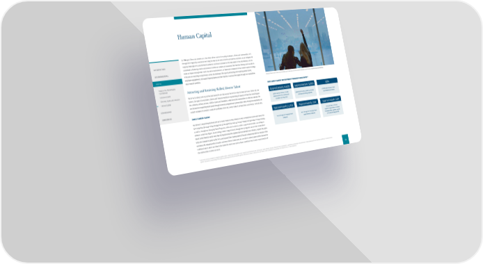 Human Capital At JPMorgan Chase, our people are a key driver of our success in serving customers, clients and communities. It is through their ingenuity, excellence and integrity that we are able to build a prosperous business. As we navigate the INTRODUCTION ongoing challenges of a post-COVID 19 pandemic world and compete for the best talent in the marketplace, we are committed to fostering a work environment in which our people are supported, feel like they belong, and are able to ENVIRONMENTAL make an impact through their work. Our work environment is an important component of our human capital strategy. It focuses on investing in experiences across the employee life-cycle by attracting and retaining skilled talent, SOCIAL employee engagement, and supporting employees and their families in various life stages through our competitive JPMorgan Chase strives to attract and retain skilled and diverse talent, with over 290,000 employees around the world. Pictured: Jersey City, New Jersey total rewards portfolio. Feature: Our Racial Equity Commitment Attracting and Retaining Skilled, Diverse Talent 2022 EARLY CAREER RECRUITMENT PROGRAM HIGHLIGHTS43 Inclusive Growth Diversity, Equity and Inclusion We strive to attract and recruit the best talent for all roles across the Firm in order to best serve our clients and cus- Approximately 4,600 Approximately 5,000 48% Human Capital tomers. Our goal is to maintain a diverse and inclusive workforce representing all aspects of diversity, including gen- der, ethnicity, military service, LGBTQ+ status and disabilities, refective of the communities in which we operate. We global summer interns, of which global full-time hires joined our Analyst of 2022 global summer intern approximately 72% received and and Associate hiring programs class identifed as women GOVERNANCE are focused on expanding talent pools through numerous programs and partnerships. When hiring new employees, we accepted returning ofers expect managers to consider a slate of candidates who bring a wide range of perspectives, experiences, and skill sets. APPENDICES EARLY CAREER TALENT Approximately 1,200 Approximately 200 Approximately 350 We believe in supporting students and early career talent as they embark on their professional careers and grow into Emerging Talent Software future leaders. We support the development of new talent through our formal Analyst and Associate hiring programs, hires through all Emerging Talent hires through the Emerging Talent Engineer Program hires recruited programs Apprenticeship programs from educational pipelines outside as well as through our Emerging Talent Programs, which aim to attract a wider range of talent either pre-college or of a traditional degree path without a university degree. By attracting a wider range of talent through these programs, we are able to introduce talent to the fnancial sector who may not typically have the opportunity to experience our industry, explore the possi- bility of a long-term career at the Firm, and support their development of life and professional skills for success in the workplace. By engaging with a broader and more diverse talent pool, we are able to extend opportunities beyond the traditional places where we historically looked for talent and seek to have a workforce that is more representative of the communities in which we serve. 43 Information on EEO race/ethnicity categories, gender, LGBTQ+, veteran status and disability status is based on self-identifcation and self-disclosure. Unless otherwise indicated, information on EEO race/ethnicity is presented as a percentage of the respective U.S.-based population who self-identifed race/ethnicity and information on gender is presented as a percentage of the respective global population who self-identifed gender; information on LGBTQ+, veteran status and disability status is presented as a percentage of the respective total U.S.-based population. 43