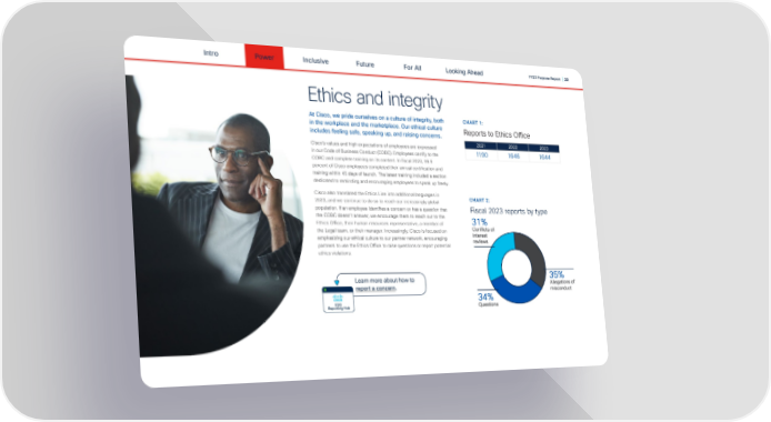 Intro Power Inclusive Future For All FY23 Purpose Report | 22 Looking Ahead Ethics and integrity At Cisco, we pride ourselves on a culture of integrity, both CHART 1: in the workplace and the marketplace. Our ethical culture Reports to Ethics O昀케ce includes feeling safe, speaking up, and raising concerns. Cisco’s values and high expectations of employees are expressed 2021 2022 2023 in our Code of Business Conduct (COBC). Employees certify to the 1190 1646 1644 COBC and complete training on its content. In 昀椀scal 2023, 99.9 percent of Cisco employees completed their annual certi昀椀cation and training within 45 days of launch. The latest training included a section dedicated to reminding and encouraging employees to speak up freely. Cisco also translated the Ethics Line into additional languages in CHART 2: 2023, and we continue to do so to reach our increasingly global population. If an employee identi昀椀es a concern or has a question that Fiscal 2023 reports by type the COBC doesn’t answer, we encourage them to reach out to the Ethics O昀케ce, their human resources representative, a member of the Legal team, or their manager. Increasingly, Cisco is focused on emphasizing our ethical culture to our partner network, encouraging partners to use the Ethics O昀케ce to raise questions or report potential ethics violations. Learn more about how to report a concern. ESG Reporting Hub