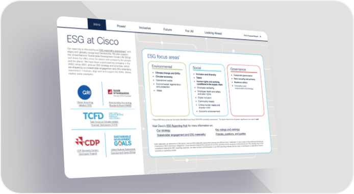 Intro Power Inclusive Future For All FY23 Purpose Report | 5 Looking Ahead ESG at Cisco 1 Our reporting is informed by an ESG materiality assessment and * aligns with globally recognized frameworks. We also support ESG focus areas the United Nations’ Sustainable Development Goals (UN SDGs) and share the UN’s vision for peace and prosperity for people and the planet. We have been a participating company in the Environmental Social Governance UNGC since 2001, and our ESG strategy and priorities, which are shaped by our stakeholder engagement and ESG materiality ● Corporate governance 1 ● Climate change and GHGs ● Inclusion and diversity assessment initiatives, align with and support the SDGs. Below, explore some examples: ● Circular economy ● Talent ● Data security and privacy ● Operational waste ● Human rights and working ● Business ethics ● Environmental regeneration conditions in the supply chain ● Innovation and responsible technology and protection ● Employee wellbeing ● Water ● Employee health and safety and labor rights ● Digital inclusion ● Community impact Global Reporting Sustainability Accounting ● Critical human needs and Initiative (GRI) Standards Board (SASB) disaster relief ● Economic empowerment 1 Task Force on Climate-related * T hese ESG focus areas are the topics identi昀椀ed in our 昀椀scal 2023 ESG materiality assessment. The topics found to be of greater signi昀椀cance are noted in bold. Financial Disclosures (TCFD) Visit Cisco’s ESG Reporting Hub for more information on: Our strategy Key ratings and rankings 1 Stakeholder engagement and ESG materiality Policies, positions, and guides 1 ESG materiality, as referred to in this report, and our ESG materiality assessment process are di昀昀erent from “materiality” in the context of Securities and Exchange Commission (SEC) disclosure obligations. Issues deemed material for purposes of our ESG reporting and for purposes of determining our ESG strategy may not be CDP (formerly Carbon United Nations Sustainable considered material for SEC reporting purposes, nor does inclusion of information in our ESG reporting indicate that the topic or information is material to Cisco’s Disclosure Project) Development Goals (SDGs) business or operating results.