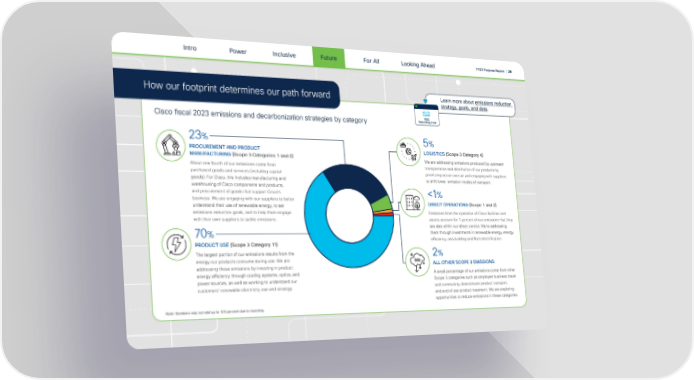 Intro Power Inclusive Future For All FY23 Purpose Report | 36 Looking Ahead How our footprint determines our path forward Learn more about emissions reduction strategy, goals, and data. ESG Reporting Hub Cisco 昀椀scal 2023 emissions and decarbonization strategies by category 23% 5% PROCUREMENT AND PRODUCT LOGISTICS (Scope 3 Category 4) MANUFACTURING (Scope 3 Categories 1 and 2) We are addressing emissions produced by upstream About one fourth of our emissions come from transportation and distribution of our products by purchased goods and services (including capital prioritizing ocean over air and engaging with suppliers goods). For Cisco, this includes manufacturing and to shift lower-emission modes of transport. warehousing of Cisco components and products, and procurement of goods that support Cisco’s