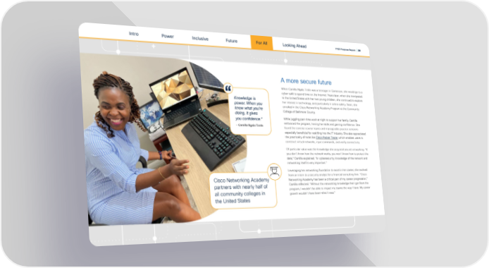 Intro Power Inclusive Future For All FY23 Purpose Report | 56 Looking Ahead A more secure future When Camilla Ngala Timfe was a teenager in Cameroon, she would go to a cyber café to spend time on the Internet. Years later, when she immigrated to the United States with her two young children, she continued to explore Knowledge is her interest in technology, and particularly in online safety. Soon, she power. When you enrolled in the Cisco Networking Academy Program at the Community know what you’re College of Baltimore County. doing, it gives While juggling part-time work at night to support her family, Camilla you con昀椀dence.” - Camilla Ngala Timfe embraced the program, honing her skills and gaining con昀椀dence. She found the concise course topics and manageable practice sessions especially bene昀椀cial for reskilling into the IT industry. She also appreciated the practicality of tools like Cisco Packet Tracer, which enables users to construct virtual networks, input commands, and verify connectivity. Of particular value was the knowledge she acquired around networking. “If you don’t know how the network works, you won’t know how to protect the data,” Camilla explained. “In cybersecurity, knowledge of the network and networking itself is very important.” Leveraging her networking foundation to excel in her career, she evolved from an intern to a security analyst for a 昀椀nancial consulting 昀椀rm. “Cisco Cisco Networking Academy Networking Academy has been a critical part of my career progression,” partners with nearly half of Camilla re昀氀ected. “Without the networking knowledge that I got from the all community colleges in program, I wouldn’t be able to impact my teams the way I have. My career growth wouldn’t have been what it was.” the United States