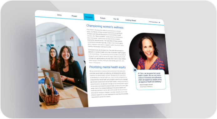 Intro Power Inclusive Future For All FY23 Purpose Report | 30 Looking Ahead Championing women’s wellness Cisco doesn’t shy away from di昀케cult conversations on sensitive topics. Our Women of Cisco Inclusive Community’s annual Women of Impact event featured discussions on crucial women’s health concerns, like “Mastering Midlife,” which opened up conversations about menopause-related issues and featured senior leaders sharing their personal stories. The ripple e昀昀ect of these powerful conversations extended regionally, notably in the United Kingdom, where employees and experts engaged in public discussions about infertility, menstruation, and loss of a child. Conversations are just the beginning. Cisco also demonstrated its dedication to women’s health with a new virtual pelvic health program in the United States. This pioneering initiative provides virtual physical therapy for pelvic health at various life stages, addressing the needs of those with vaginal anatomy who may never intend to have children, those trying to conceive, those who have already given birth, and those in menopause. Prioritizing mental health equity We are committed to creating a work environment that values and prioritizes mental health and wellbeing—and destigmatizes seeking At Cisco, we recognize that mental treatment for mental health concerns. Recognizing the importance health is health. We can only build a of a昀昀ordability for mental health care, Cisco recently embarked on a culture of inclusivity and authenticity comprehensive mental health parity analysis, examining the coverage gap between physical and mental health needs in various countries. In when we support our people across several locations, we adjusted coverage so that mental health support all aspects of health and wellbeing.” mirrors what is provided for physical health concerns. But some gaps - Sheila Champion-Smeeth, remain, due to the complex landscape of insurance markets and Global Head of Wellbeing healthcare systems in certain parts of the world. As we continue to advocate for necessary changes in provider networks, we not only enhance support for our own employees but also help drive broader improvements across the industry.