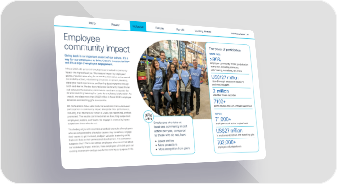 Intro Power Inclusive Future For All FY23 Purpose Report | 31 Looking Ahead Employee The power of participation community impact SINCE FY20: >80% Giving back is an important aspect of our culture. It’s a employee community impact participation way for our employees to bring Cisco’s purpose to life— every year, including advocacy, and it’s a sign of employee engagement. volunteering, donations, and more In 昀椀scal 2023, 85 percent of employees participated in community impact—the highest level yet. We measure impact by employees’ US$127 million actions, including advocating for causes they care about, environmental raised through employee donations sustainability actions, volunteering (virtual and in-person), donating, and matching gifts digital give-back experiences, and learning about nonpro昀椀ts through lunch-and-learns. We also launched a new Community Impact Portal and removed the monetary minimum to nominate a nonpro昀椀t for 2 million donation matching, lowering the barrier for employees to take action. As volunteer hours recorded a result, we raised more than US$27 million in 昀椀scal 2023 in employee donations and matching gifts to nonpro昀椀ts. 7100+ We completed a three-year study that examined Cisco employees’ global causes and U.S. schools supported participation in community impact alongside their performance, including their likeliness to remain at Cisco, get recognized, and get IN FY23: promoted. The results con昀椀rmed what we have long suspected: employees, leaders, and teams that engage in community impact 71,000+ outperform those who do not. Employees who take at least one community impact employees took action to give back This 昀椀nding aligns with countless anecdotal examples of employees who are empowered to champion causes they care about, engage action per year, compared US$27 million their teams to get involved, and gain valuable leadership skills to those who do not, have: that contribute to their professional development. This correlation in employee donations and matching gifts suggests that if Cisco can attract employees who are excited about ● Lower attrition our community impact mission, these employees will build upon our ● More promotions 702,000+ existing momentum—and go even further to bring our purpose to life. ● More recognition from peers employee volunteer hours