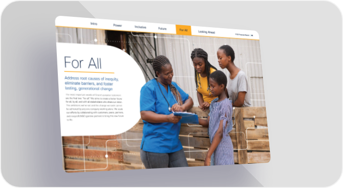 Intro Power Inclusive Future For All FY23 Purpose Report | 46 Looking Ahead For All Address root causes of inequity, eliminate barriers, and foster lasting, generational change The most important words of Cisco’s purpose statement are the 昀椀nal two: “for all.” We strive to create a better future for all, by all, and with all stakeholders who share our vision. The ambitions we’ve set and the change we seek cannot be achieved by any one company working alone. We scale our e昀昀orts by collaborating with customers, peers, partners, and nonpro昀椀t/NGO grantee partners to bring this new future to life.