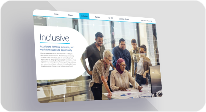 Intro Power Inclusive Future For All FY23 Purpose Report | 23 Looking Ahead Inclusive Accelerate fairness, inclusion, and equitable access to opportunity Cisco’s commitment to our people powers our ability to drive positive societal change. We are recognized among the world’s best workplaces, and we continually strive to improve. For us, doing right by our people is not only a moral imperative but a strategic one. Fostering a thriving, inclusive, and supportive workplace culture is intrinsically linked to our broader purpose of powering an inclusive future for all.