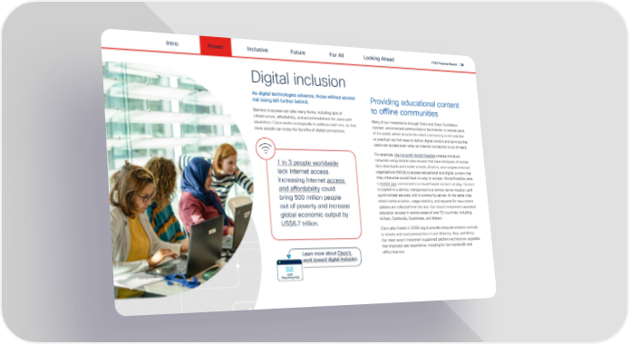 Intro Power Inclusive Future For All FY23 Purpose Report | 20 Looking Ahead Digital inclusion As digital technologies advance, those without access Providing educational content risk being left further behind. Barriers to access can take many forms, including lack of to o昀툀ine communities infrastructure, a昀昀ordability, and accommodations for users with Many of our investments through Cisco and Cisco Foundation disabilities. Cisco works strategically to address each one, so that connect unconnected communities to the Internet. In remote parts more people can enjoy the bene昀椀ts of digital connections. of the world, where around-the-clock connectivity is not possible or practical, we 昀椀nd ways to deliver digital content and services that users can access even when an Internet connection is out of reach. For example, the nonpro昀椀t World Possible creates miniature 1 in 3 people worldwide networks using remote area servers that save terabytes of mobile data downloads and enable schools, libraries, and nongovernmental lack Internet access. organizations (NGOs) to access educational and digital content that Increasing Internet access they otherwise would have no way to access. World Possible uses a mobile app connected to a cloud-based content catalog. Content and a昀昀ordability could is copied to a device, transported to a remote server location, and bring 500 million people synchronized securely with a community server. At the same time, out of poverty and increase email communication, usage statistics, and requests for new content updates are collected from the site. Our recent investment expanded global economic output by education access in remote areas of over 53 countries, including US$6.7 trillion. Kiribati, Cambodia, Guatemala, and Malawi. Cisco also invests in CODE.org to provide computer science curricula to remote and rural communities in Latin America, Asia, and Africa. Our most recent investment supported platform architecture upgrades that improved user experience, including for low-bandwidth and o昀툀ine learners. Learn more about Cisco's work toward digital inclusion. ESG Reporting Hub