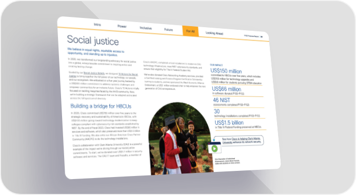 Intro Power Inclusive Future For All FY23 Purpose Report | 58 Looking Ahead Social justice We believe in equal rights, equitable access to opportunity, and standing up to injustice. In 2020, we transformed our longstanding advocacy for social justice Cisco's AACPC, completed critical installations to modernize CAU OUR IMPACT into a global, enterprisewide commitment to inspiring action and technology infrastructure, meet NIST cybersecurity standards, and creating lasting change. ensure their eligibility for Title IV Federal Student Aid. US$150 million Guided by our Social Justice Beliefs, we designed 12 Actions for Social We've also donated Cisco Networking Academy services, provided committed to HBCUs over 昀椀ve years, which includes US$100 million for technology upgrades and Justice to bring together the full power of our technology, our people, a Certi昀椀ed Leasing and Finance Program Certi昀椀cation Scholarship training to students, and we sponsored the Black Economic Alliance US$50 million for students pursuing STEM education and our ecosystem. We embarked on a 昀椀ve-year journey backed by a US$300 million commitment to address systemic challenges and Endowment, a US$1 million endowed chair to help empower the next US$66 million empower communities for an inclusive future. Cisco’s 12 Actions initially generation of CAU entrepreneurs. focused on tackling inequities faced by the AA/B community. Now, in software donated FY20-FY23 we’re building a strategic framework that can be adapted and scaled across the full spectrum of diversity. 46 NIST Building a bridge for HBCUs assessments completed FY20-FY23 30 In 2020, Cisco committed US$150 million over 昀椀ve years to the strategic recovery and sustainability of America's HBCUs, with technology installations completed FY20-FY23 US$100 million going toward technology modernization to keep colleges compliant with cybersecurity risk standards established by US$1.5 billion NIST. By the end of 昀椀scal 2023, Cisco had invested US$66 million in in Title IV Federal Funding preserved at HBCUs services and software, which also preserved more than US$1.5 billion in Title IV funding. We also enlist our African American Cisco Partner Community (AACPC) to do the technology installations. See how Cisco is helping Clark Atlanta Cisco’s collaboration with Clark Atlanta University (CAU) is a powerful University enhance its network security. example of the impact we’re driving through our social justice commitments. To start, we’ve donated over US$1.7 million in security software and services. The CAU IT team and Procellis, a member of